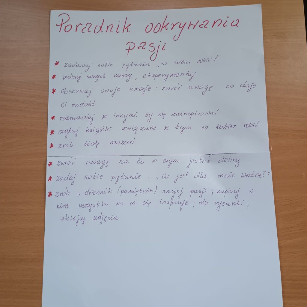 Na zakończenie zajęć wspólnie opracowaliśmy poradnik odkrywania pasji.