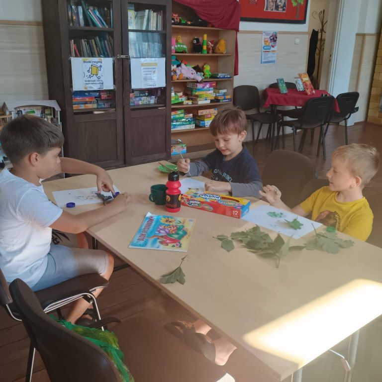 25 lipca w Filii Bibliotecznej w Trześciance dzieci poznawały drzewa z pomocą książek „ Jakie to drzewo?” i „Mój atlas roślin Polski”. Po spacerze stworzyły wyjątkowe prace plastyczne z liści i farb. Natura + sztuka = magiczne popołudnie!